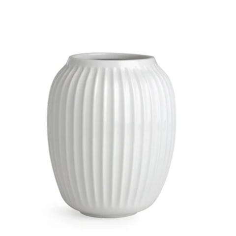 Kähler Hammershøi vase i hvit keramikk. Vasen har et klassisk, riflet design og rund form. Egnet til snittblomster, grener eller som enkel dekor på bord, hylle eller vinduskarm. 22 cm høy.