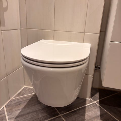 Vegghengt toalett i hvit farge av merket porsgrund Toalettet er montert på vegg med skjult sisterne bak flislagt vegg. Passer til baderom med vegghengt løsning for enklere rengjøring av gulv under toalettet.
