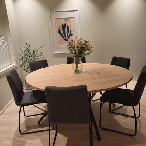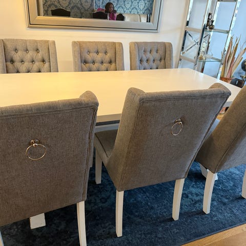 Spisestue med seks stoler og sofa.