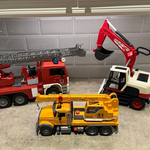 lekebiler og kjøretøysett. Inneholder flere ulike kjøretøy, blant annet brannbiler, politibil, jeep, lastebil og andre utryknings- og arbeidskjøretøy. Det følger også med en parkeringsstasjon eller garasje med flere plasser til bilene. Plast- og metallbaserte leker egnet for lek med kjøretøy og utrykningsscenarier på gulv eller lekematte.