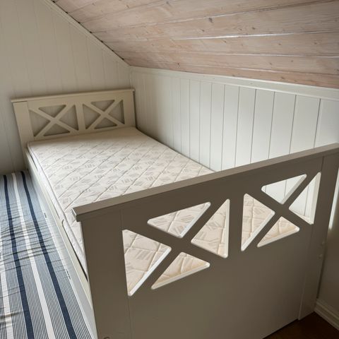 Seng (150x200) og madrass fra IKEA. Gammel, men funksjonell. Noen deler er byttet ut. Midtbjelken trenger støtte, noen som er litt hendig kan bygge en fot, men vi brukte bare bøker (bilde 4)!