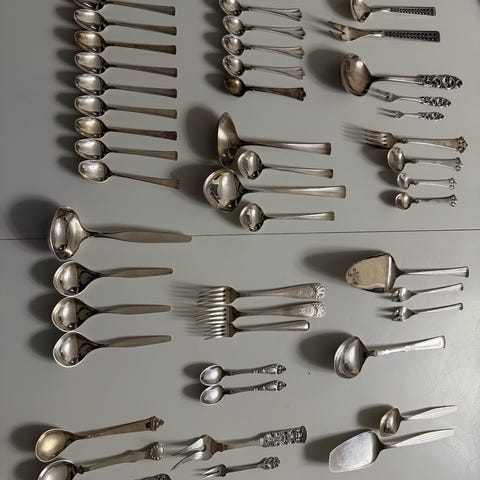 Bestikksett sølvfarget. Selges samlet kom med tilbud 1788 gram ca -+.