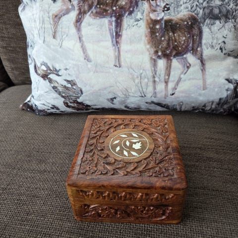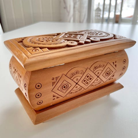 Eldre tre skrin med utskjeringer/smykkeskrin