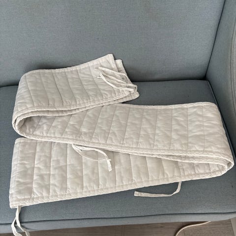 Sebra sengekant til barn i quiltet tekstil. Sengekanten er i en lys grå farge og har bølgeformet quiltet mønster. Den er myk og polstret, og egner seg til bruk i sprinkelseng eller annen barneseng for å gi en myk kant mot sengesidene.