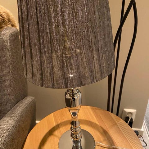 Pent brukt bordlampe i grå farge. Kjøpt på Kremmerhuset.