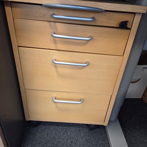 2 stk Skap med uttrekkbare skuffer i treverk. Skapet har to hoveddeler, med øvre del som lukket oppbevaringsrom og nedre del med fire uttrekkbare trådkurver/skuffer. Frontene har treimitasjon/treverk og nøytral farge som passer i kontor, bod eller annet oppbevaringsrom. Egnet til sortering og lagring av dokumenter, utstyr eller annet innhold som ønskes organisert i separate kurver.