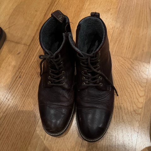 Jean Paul pensko i størrelse 43. Skoene er brune med mørk polstret ankelkant og snøring foran. Yttersålen er i gummi med mønster for bedre grep. Modellen fremstår som en ankelhøy pensko som kan brukes til hverdags og penere anledninger for herre.