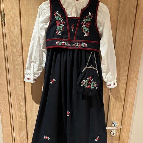 Festdrakt med skjorte str. 110/116 selges. Drakten har røket litt i sømmen på linningen. Dette kan enkelt sys, men forkle dekker det.