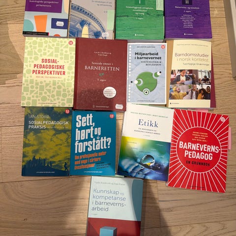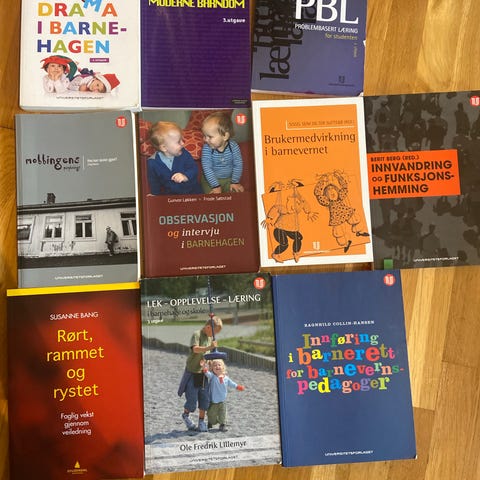 Samling med ulike fagbøker innen barnehagepedagogikk, didaktikk og utviklingspsykologi. Bøkene omhandler blant annet rammeplan og didaktisk praksis i barnehagen, barnehagens organisering, barnehagerom og lekemiljø, utviklingspsykologiske perspektiver på barns oppvekst og andre relevante temaer for arbeid med barn i barnehage og tidlig oppvekst. Egner seg som pensumlitteratur eller faglig fordypning for studenter og yrkesutøvere innen barnehage og pedagogikk.