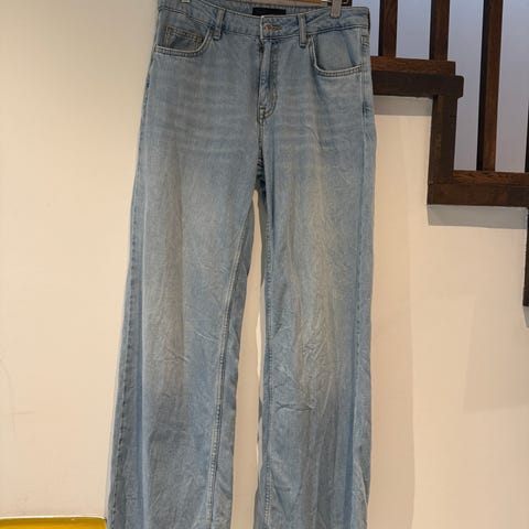 Zara jeans for dame i blå denim. Buksen er i størrelse EUR 38 med livvidde W28. Produsert i denimstoff med klassisk femlommers design og beltehemper. Passer til hverdagsbruk og kan kombineres med ulike topper og sko for både avslappede og mer oppkledde antrekk.