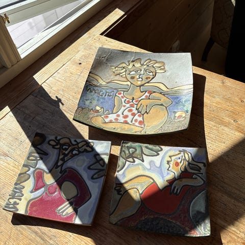 Selger en dekorativ serie med 4 håndlagde og signerte glassbilder.