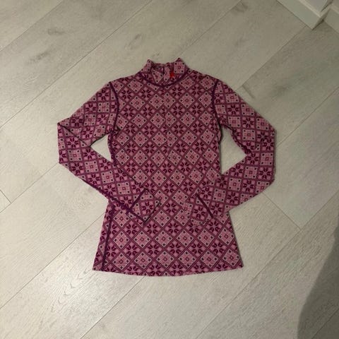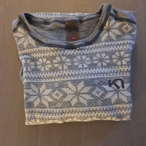 Kari Traa ulltrøye for dame i størrelse S. Trøyen er laget i merinoull og har grå bunnfarge med mønster. Den har knappestolpe foran og er egnet som innerste lag til hverdagsbruk eller som undertøy til utendørsaktiviteter i kjølige temperaturer.