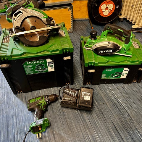 Sett med Hikoki batteriverktøy i 12V-serien. Bildene viser blant annet kombinasjonen DS 12DA drill/skruddraill, WH 12DA slagskrutrekker og CR 12DA tigersag. Verktøyene leveres i plastkoffert.