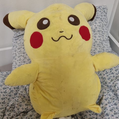 Pokémon kosedyr Pikachu i gul farge. Myk figur som passer som kosebamse eller samleobjekt for barn som liker Pokémon-universet. Vist sammen med annet leker på bilde, men annonsen gjelder Pokémon-kosedyret Pikachu og alt som vises i hyllen.mange fine leker pris for alt kr 500 gi bud på alt kan sendes mot frakt