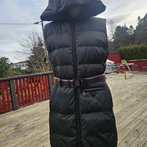 Prada jakke + vest for dame i størrelse M. Vest i svart nylon med vattert/puffet design og høy krage. Modellen har frontlukking med glidelås og trykknapper, samt sidelommer. Materiale i nylon gjør jakken/vesten lett og anvendelig som ytterplagg eller som et ekstra isolerende lag over andre plagg.