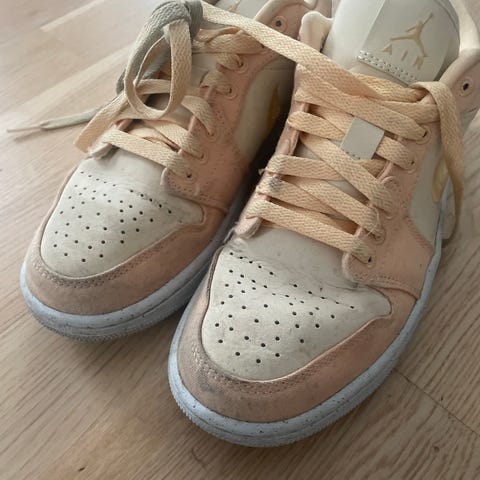 Jordan sneakers joggesko i størrelse 37. Skoene er lave med snøring og har overdel i hovedsakelig skinnmateriale. Fargekombinasjon gul og hvit med klassiske Jordan-detaljer på hæl og pløse. Passer til hverdagsbruk og fritidsaktiviteter.