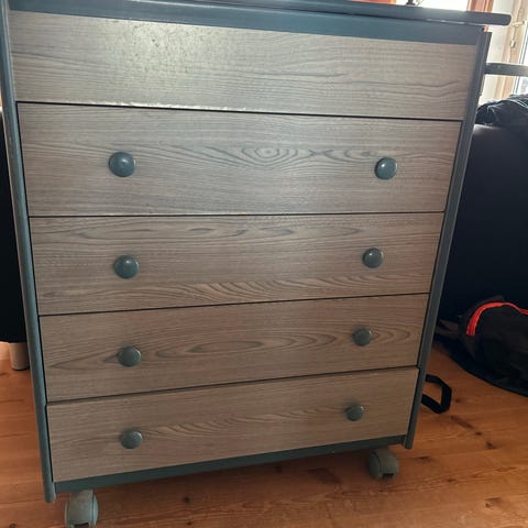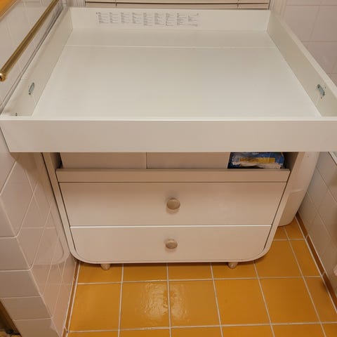 Stellekommode med integrert badekar og flere skuffer for oppbevaring. Øvre del har badekar med formet liggeflate og rominndeling for såpe og småting. Underdelen består av kommode med flere skuffer med håndtak for praktisk lagring av babyutstyr og tekstiler. Enheten står på hjul, noe som gjør den enkel å flytte ved behov. Nøytral lys farge som passer inn i de fleste barnerom og baderom.