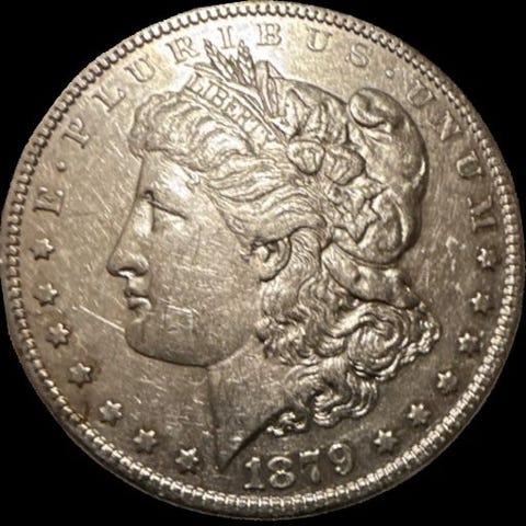 Morgan Silver Dollar fra 1880 med S‑myntmerke.