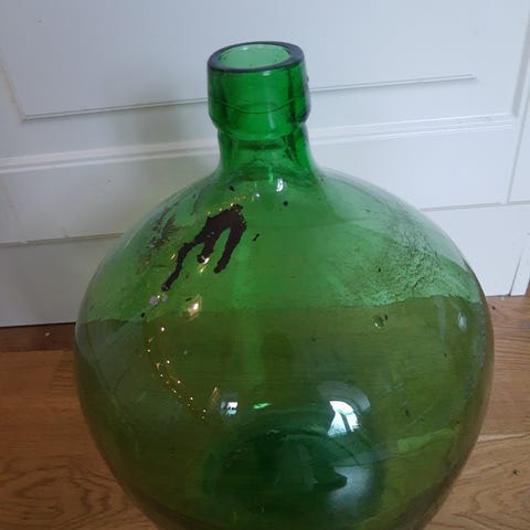 Vinballong med kork, er fin til dekorasjon. Kan også brukes til det den var brukt til nemlig å lage vin på.Kurven gir flasken et rustikt preg og gjør den enkel å flytte på.