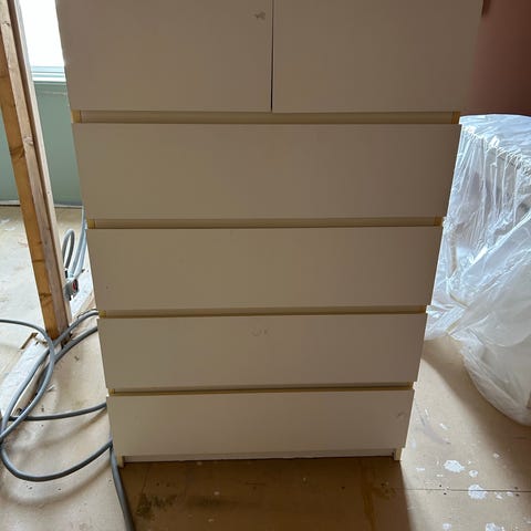 Gies bort kommode da det er en ødelagt skuff nederst som ikke vil lukkes. Kan sikkert fikses. Den er malt hvit, så kan hende den trenger et malingstrøl evt