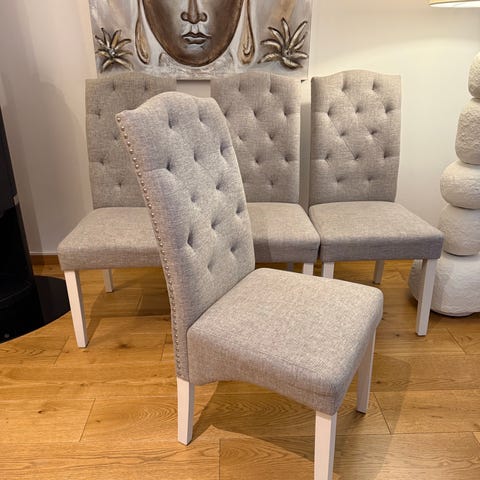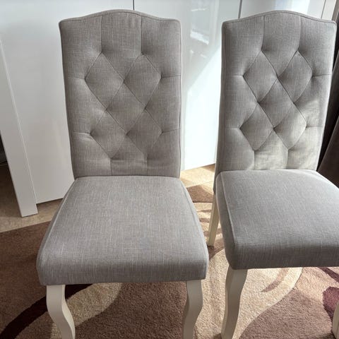 Spisestuestoler selges samlet for 1200 kr (200 kr per stol). Stolene er beige med hvite ben. De har noen bruksmerker, se bilder, men fremstår ellers pene.