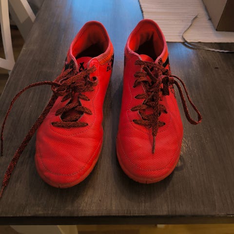Adidas fotballsko i størrelse 34. Skoene er oransje med svarte detaljer og lisser, samt hvite striper bak på hælen. Undersålen har knotter som egner seg for spill på kunstgress eller harde underlag. Modellen er merket som herre/unisex (male). Passer til barn som trenger fotballsko i denne størrelsen.