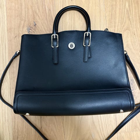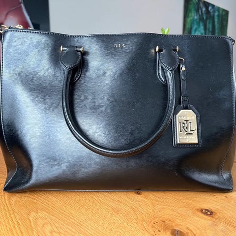 Ralph Lauren håndveske i svart lær for dame. Vesken har to korte hanker og en avtakbar, justerbar skulderrem for variert bruk. Lukking med glidelås øverst, med to hovedrom og et midtre rom med glidelås for bedre organisering. Innvendig fôr med Ralph Lauren-logo og innvendig glidelåslomme samt mindre åpne lommer. Metall-detaljer i gullfarge og liten logo på forsiden. Egnet som hverdagsveske eller til jobb, med plass til nødvendige eiendeler som lommebok, mobil, nøkler og små personlige ting.