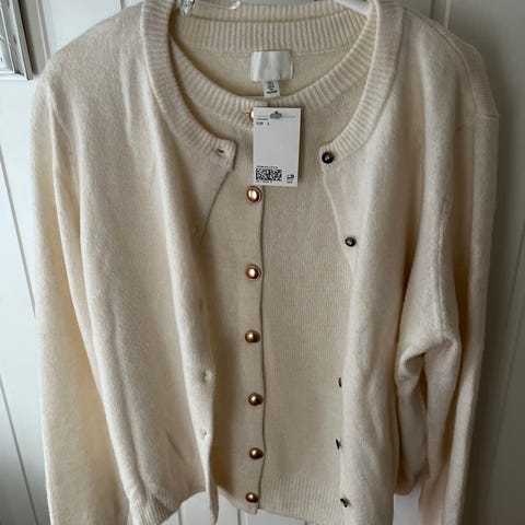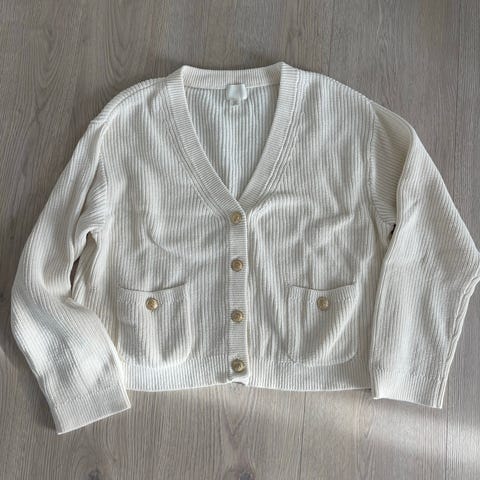 H&M cardigan for dame i størrelse XL. Strikket modell i burgunderrød farge med strukturmønster og rund hals. Jakken har gullknapper i front og er laget i en blanding av bomull, polyester og polyamid. Ny pris var 599kr. Den er lite brukt og i god stand.