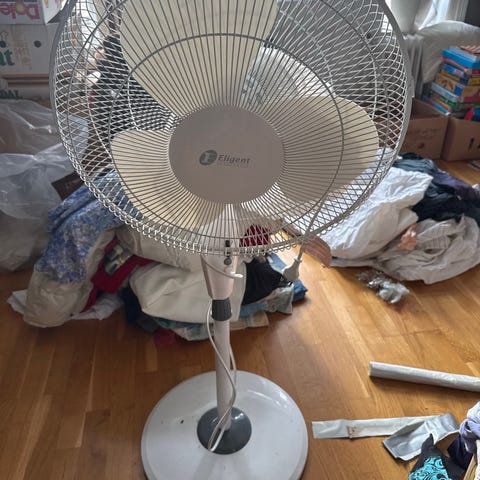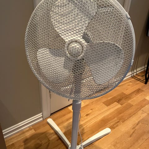 Må hentes. Gulvvifte i hvit farge. Viften står på rund fot. Egnet for bruk innendørs for sirkulering av luft i rom som stue, soverom eller kontor. Strømtilkobling med ledning.