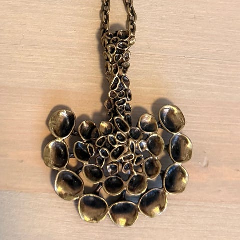 Dette er et finsk halssmykke i bronse fra serien "Reindeer Moss", designet av Hannu Ikonen for Valo-Koru på 1960- eller 1970-tallet.
