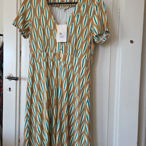 Jeg er normalt XL i kjoler. Men denne måtte jeg opp en størrelse på. Nydelige farver, bunnfarge brun. Fargene kommer best fram på bilde 4,5,6 og 7.