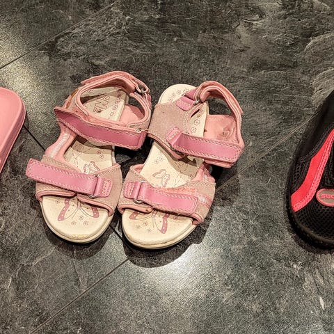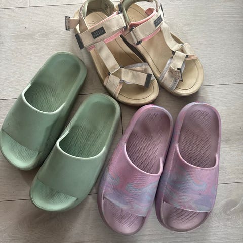Slippersene og joggeskoene er i str 28. Sandalene er str 27, men brukt samtidig her 🌸