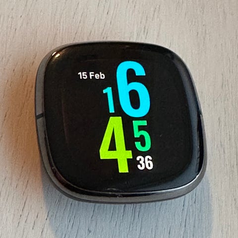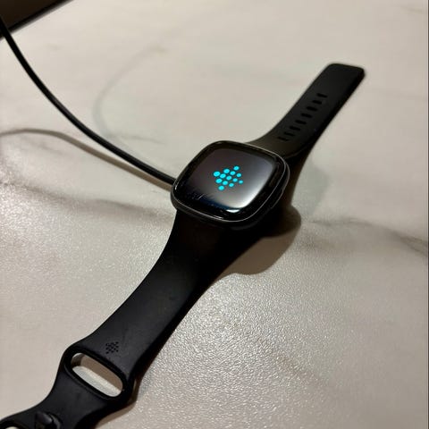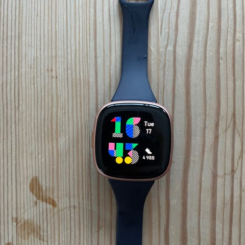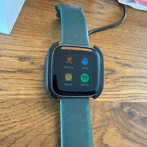 Fitbit Sense 2 med lader og grønn justerbar reim selges.