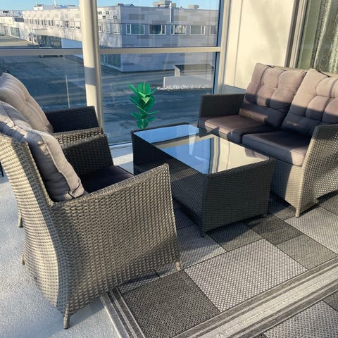 Selger brukt loungesett. Må hentes hos selger på Lambertseter. Møblene har for det meste stått under tak/inne i innglasset balkong. Har noen bruksmerker og slitasje her og der, men ikke noe jeg anser som problematisk. Trekket til putene er vasket etter at bildene ble tatt.