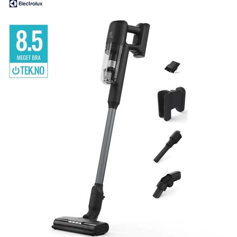 Electrolux trådløs skaftstøvsuger med integrert håndstøvsuger i hvit farge. Støvsugeren leveres med flere munnstykker og tilbehør, inkludert fugemunnstykke, børstemunnstykke, gulvmunnstykke og fleksibel slange, samt oppbevaringspose fra Electrolux. Håndenheten kan tas av for punktvis rengjøring av mindre flater, møbler og kanskje bilinteriør.