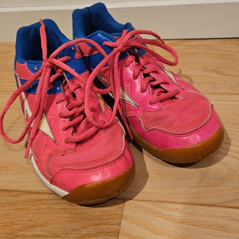 Skoene er hovedsakelig hvite med røde og blå detaljer, samt rød og blå yttersåle. Overdelen er i tekstil med syntetiske forsterkninger, og sålen er i gummi med mønster for godt grep. Modellen har snøring for justerbar passform. Passer til innendørs og utendørs bruk til trening, løping eller fritid.