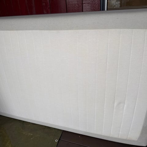 IKEA rammemadrass enkeltseng i hvit og lysgrå farge. Passer som enkeltseng på soverom, gjesterom eller hybel. Har avtagbare ben som gir stabil støtte og gjør at sengen kan plasseres direkte på gulvet uten sengebunn eller ramme. Ekstra madrass oppå har medium fasthet. Må hentes