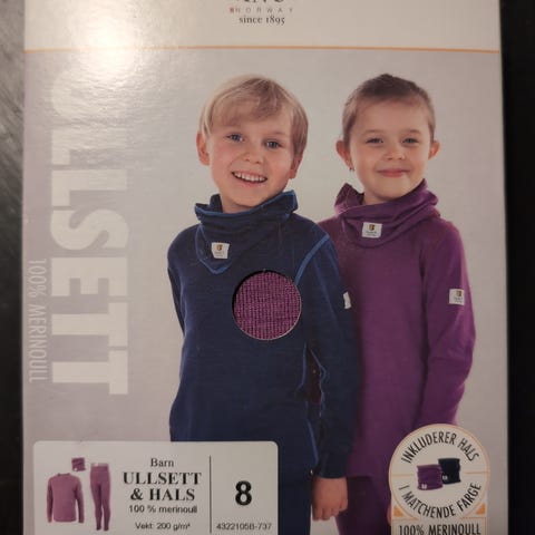 Janus ullsett med hals for barn, størrelse 128. Sett i lilla farge laget av 100 % merinoull. Passer til jente. Ullsettet består av overdel og bukse, samt hals i samme materiale. Velegnet som innerste lag på kalde dager eller til bruk i hverdagen der det er behov for et mykt og temperaturregulerende ullplagg.
