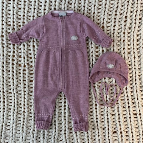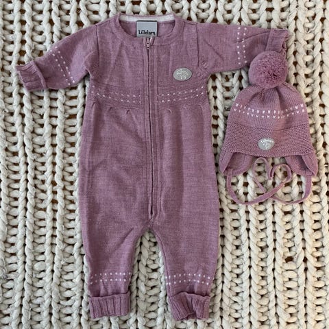 Lillelam ullsett til baby jente i størrelse 62. Sett i rosa merinoull som består av heldress med glidelås, lue med knyting og dusk, samt sokker/tøfler med snøring. Strikket strukturmønster på overdel og detaljer i kontrastfarge. Materiale i myk merinoull som egner seg godt som innerste eller mellomste lag for små barn.