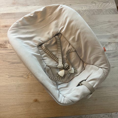 Stokke barnestol seteinnsats med sele i beige tekstil og plast. Seteinnsatsen har integrert 5-punktssele med justerbare stropper og plastspenner. Undersiden har ventilert plastbase og festepunkter for montering på kompatibel Stokke barnestol. Egnet som ekstra eller utskiftbart sete til små barn som trenger støtte og sikring i barnestolen.