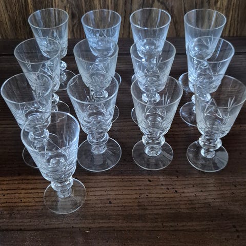 Krystall hetvinglass på stett i klart glass. Glassene har slipt dekor og fasettert stettfot.