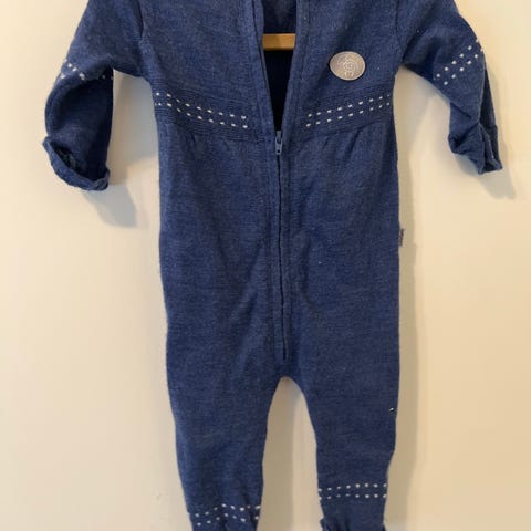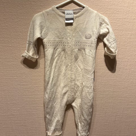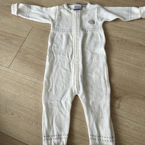 Lillelam heldress i merinoull for baby, unisexmodell i størrelse 62. Dressen er en del brukt, og har litt svak misfarging ved glidelås foran. Det er også reparert et lite hull øverst bak, men dette er pent reparert og bør ikke være av betydning. Dressen er ellers hel og fin og varmer like godt fortsatt.