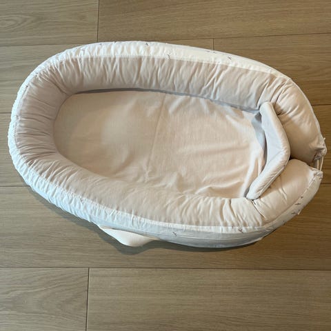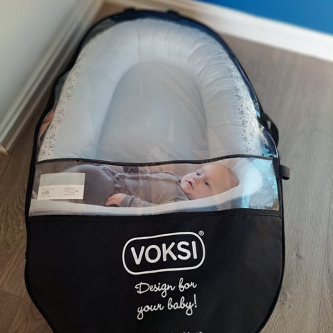 Babynest i mykt tekstil med mørk blå utside og lys, melert innside. Formen er ovalt med polstrede kanter rundt liggeflaten for å gi en avgrenset sove- og hvileplass til baby. Yttertrekket har glidelås på undersiden, og det er festebånd i fotenden. Egnet som liggeplass i seng, på sofa eller på gulv under tilsyn av voksen. Passer for spedbarn i den første perioden, avhengig av barnets størrelse og behov.