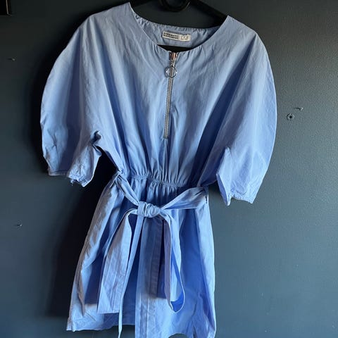 Zara hverdagskjole for dame i størrelse M. Kjolen er grønn og laget i polyester. Den har knapper foran, knytebelte i livet og trekvartlange ermer med strikk nederst. Stoffet har broderte hull- og blomsterdetaljer som gir et mønster i overflaten. Passer som hverdagskjole eller til enkle anledninger.