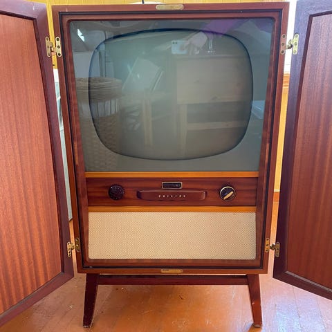 Philips TV apparat i brun utførelse. Klassisk bilde rørs-TV med innebygde manuelle kontroller på høyre side av fronten. Kabinettet har treimitasjon og står på et enkelt stativ. Egnet som retro-TV, rekvisitt eller samleobjekt. Strømkabel følger med etter det som vises på bildene. Nøyaktig modellbetegnelse og skjermstørrelse er ikke oppgitt. Vet ikke om strøm virker.