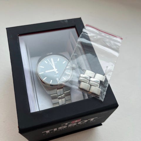 Tissot herreklokke med rund urkasse og mørk urskive. Klokken har kronograffunksjon med flere delskiver på skiven og datovisning. Den leveres med svart skinnrem og klassisk spenne. Passer som hverdagsklokke eller til penere antrekk for herre. Ingen synlig bruksmerker.