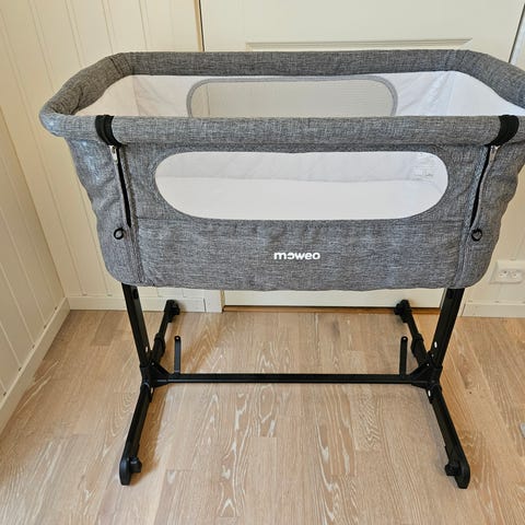 Moweo bedside crib babyseng i grå tekstil.