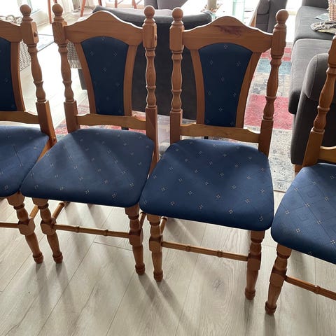 Dette er tre godt brukte spisestuestoler med trollmotiv. Det er to stoler som har samme motiv.