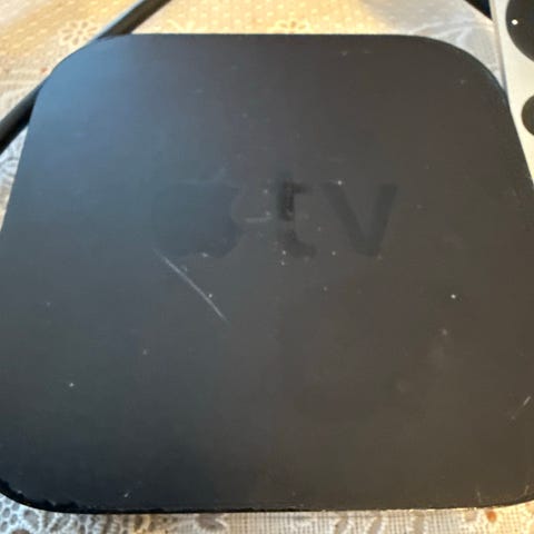 Apple TV med fjernkontroll i svart farge. Strømmespiller for tilkobling til TV via HDMI. Enheten leveres med tilhørende fjernkontroll med berøringsflate og standard navigasjonsknapper. Egnet for avspilling av filmer, serier, musikk og annet innhold fra kompatible strømmetjenester og apper, avhengig av modell og programvareversjon.