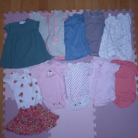 Liten klespakke str 50 / 56. Passer best til sommerbaby. 2 kjoler, 2 langermet body, 4 kortermet body, 1 pysj, 1 bukse, 1 shorts, 4 luer.